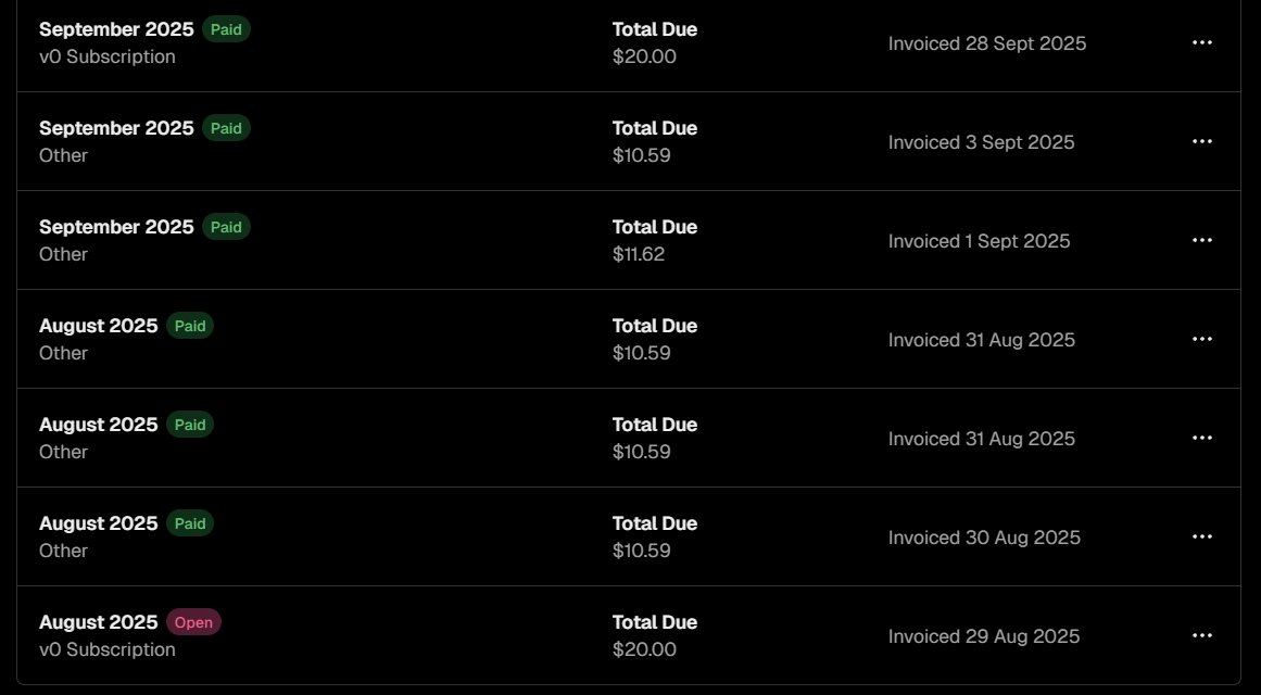 There were 2 payments pending for my v0.app account, for the months September and August. I was just able to make payment for the September month’s v0.app payment, but the August month’s payment link has expired. So because of which I am not able to use v0.app at all. My work has stopped.