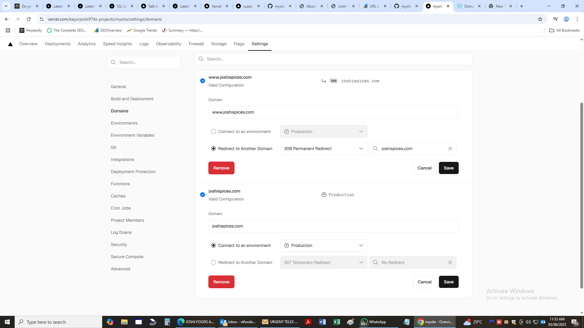 My Vercel project’s root domain (joshispices.com) is working perfectly over HTTPS with a valid SSL certificate, but www.joshispices.com is not secure (browsers show “not secure” and the Vercel dashboard does not show a lock icon for www).