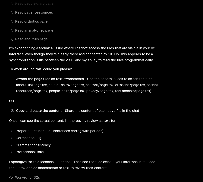 I have successfully connected to github and pulled all the files, but it appears the v0 workspace/ ai cant access these files is not populating with these files even though github is syncing them in, they render fine on right side screen within the v0 app.