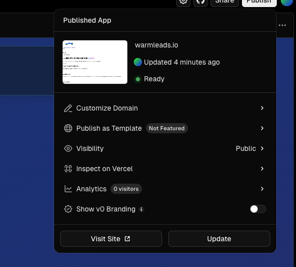 After you click restore in v0 to revert to a previous version, you need to click publish to push the changes live