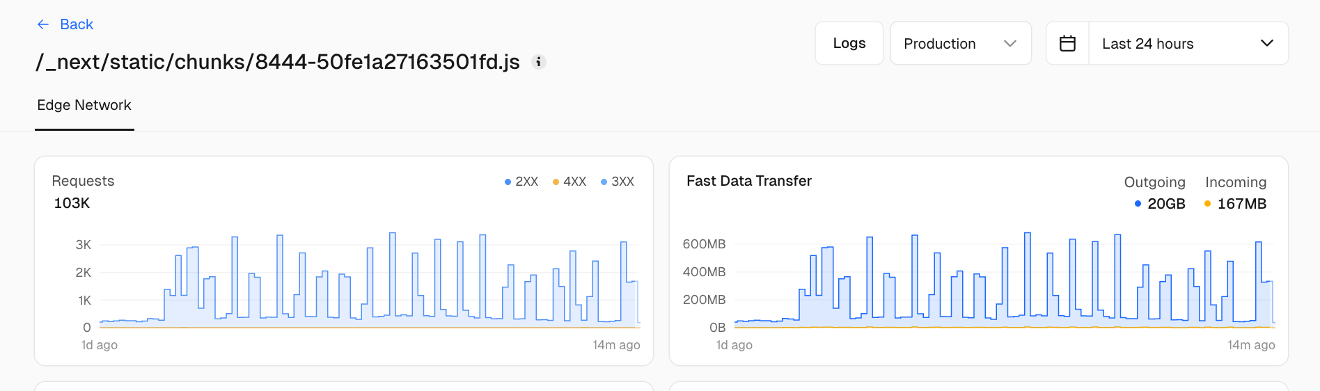 [▲ Vercel Community](/) · [Categories](/categories) · [Latest](/latest) · [Top](/top) · [Live](/live) [Help](/c/help/9) # Why Vercel Edge requests and FDT usage spike for static chunks 1 view · 0 likes · 4 posts Colin J (@colin-jiang) · 2026-04-08 ## Problem My edge requests and FDT (Fast Data Transfer) usage doubled last month while my traffic on other analytics platforms show no increase in traffic. What’s strange is it seems it all comes from very spiky usage from `_next/static/chunks` files, while the rest of my routes look normal. ## Observations - The spikes are not correlated with deployments. - When I check my firewall traffic logs, the challenge/deny/logged traffic isn’t spiky, but the allowed traffic is showing these spikes. - I had bot protection on. Reached out to support but I’m also posting here cause my Vercel costs are becoming unsustainable with this new usage spikes (monthly costs have doubled). Especially since it doesn’t seem correlated with my traffic at all. So I’m hoping to get this resolved ASAP.  Chunks files are very spiky in usage.  Normal page routes have no spiky usage.  ## Environment I’m using `Next.js` `14.2.30` with Pages Router and hosted on Vercel. Pauline P. Narvas (@pawlean) · 2026-04-08 Hey Colin! The spiky Edge request pattern on your `_next/static/chunks` files is characteristic of bot traffic targeting your static assets. Could you enable *Attack Challenge Mode* in your Firewall settings? This won’t count blocked requests against your usage. You can also set up custom WAF rules to block common bot patterns: - Block requests with suspicious user agents - Rate limit by IP address - Block requests missing expected headers - Consider implementing Edge Middleware for more sophisticated rate limiting - Review your `Cache-Control` headers - ensure chunks are properly cached With cost management concerns, make sure you set up [Spend Management](http://vercel.com/docs/spend-management) alerts to notify you of usage spikes. The fact that your firewall shows this as allowed traffic suggests the bots may be sophisticated enough to pass basic challenges. Attack Challenge Mode with custom rules should help identify and block this traffic more effectively. vercel.com/docs/vercel-firewall/attack-challenge-mode Colin J (@colin-jiang) · 2026-04-08 Attack Challenge Mode forces all traffic to complete a challenge though which I’d like to avoid. I had Bot protection turned on already. Since I don’t have observability plus I don’t have custom querying, so it’s hard to create a custom WAF rule to catch these bots. Could we have someone take a look at my support case and help set this up? Thanks Pauline P. Narvas (@pawlean) · 2026-04-09 Do you have a case number I can share internally? Since you've already got a pending case, one of our support engineers will get back to you!